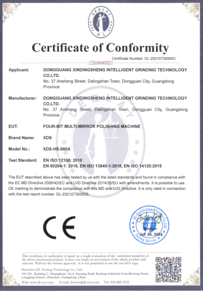東莞鑫鼎盛智能研磨科技有限公司自主研發(fā)的干濕兩用、不用治具“四位多開鏡面研磨拋光機“設(shè)備,于近日順利通過歐盟CE認證并獲頒證書,這也標志著鑫鼎盛公司產(chǎn)品質(zhì)量、技術(shù)以及安全性能均滿足國際市場的要求。